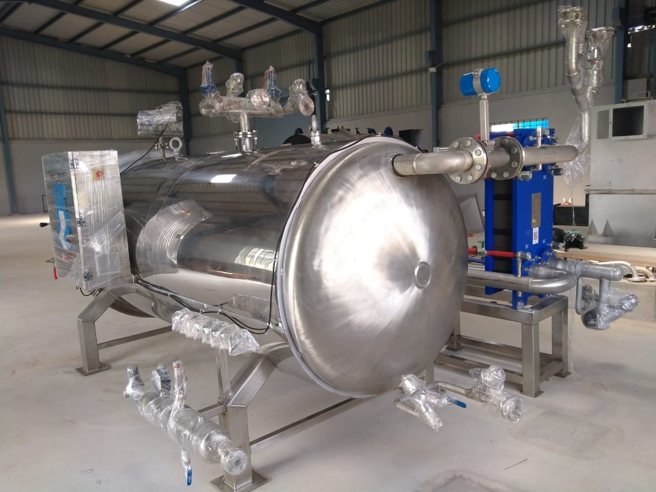 The Retort is designed for sterilization and thermal processing of packaged coconut products such as coconut milk, cream, and ready-to-eat coconut-based foods, ensuring extended shelf life while preserving flavor, nutrients, and overall product quality. It uses a high-temperature, high-pressure sterilization system for effective microbial inactivation and is constructed from food-grade stainless steel (SS 304 / SS 316) for hygiene and durability. Compatible with pouches, bottles, cans, and cartons, the retort offers precise control of temperature, pressure, and time for uniform processing. Available in batch or continuous configurations, it features automated operation with built-in safety interlocks for reliable and safe industrial use.